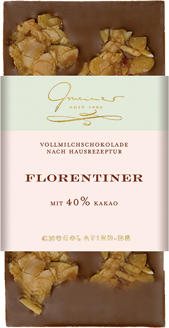 Feinste handgeschöpfte Vollmilchschokolade mit einem Kakaoanteil von 40 %. Hausgemachte Florentiner mit feinsten spanischen Mandeln und bestem Honig ergänzen den runden Geschmack der Vollmilchschokolade zu einem knackigen und höchst feinem Schokoladenerlebnis.