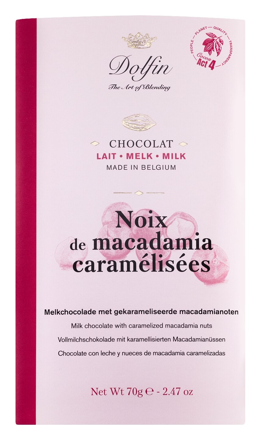 Startseite / - Belgische Dolfin Vollmilchschokolade mit karamellisierten Macadamianüssen – Noix de Macadamia Caramelisees, 70 g, 38 % Kakaoanteil
