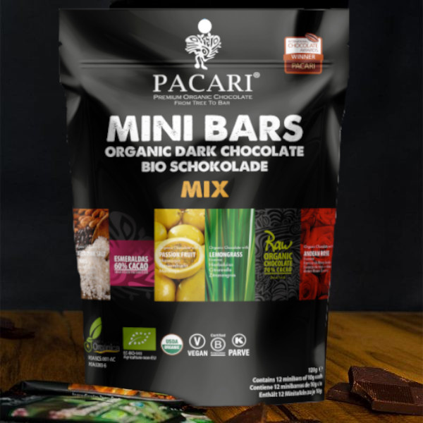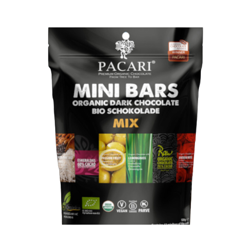 Probierset mit 12 Minitafeln mit einer Auswahl der besten Bio Schokoladen von PACCARI. Darin enthalten sind Esmeraldas 60%, Raw 70%, Cuzco Salz & Nibs, Maracuya, Zitronengras, Anden Rose.