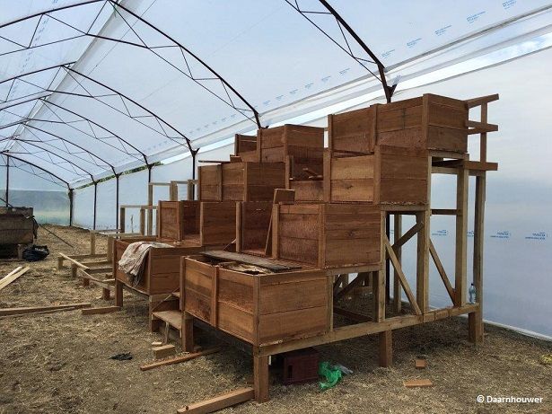 Die Gärung erfolgt in Holzkisten, drei übereinander und alle zwei Tage werden die Kakaobohen in die niedrigere Kiste geschaufelt. Der Prozess dauert ca. 5 bis 6 Tage, je nach Witterung.