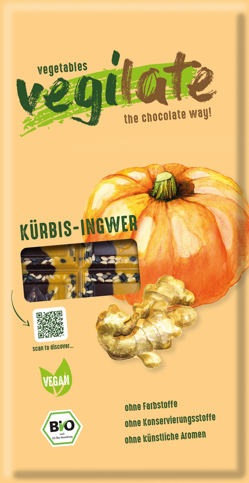 Startseite / - Vegilate Kürbis & Ingwer – innovative vegane Gemüseschokolade aus Deutschland von Coppeneur – aromatisch & würzig