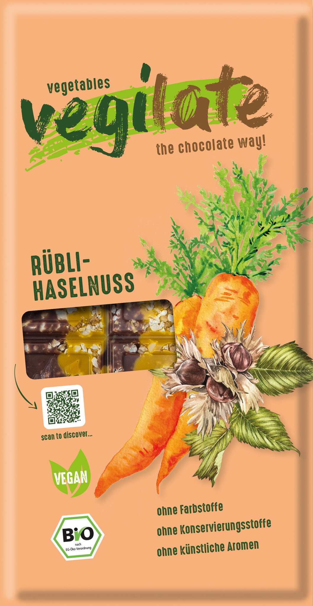 Startseite / - Vegilate Rübli & Haselnuss – innovative vegane Schokolade aus Deutschland mit 49 % Kakaoanteil, Bio-Gemüse & Haselnüssen