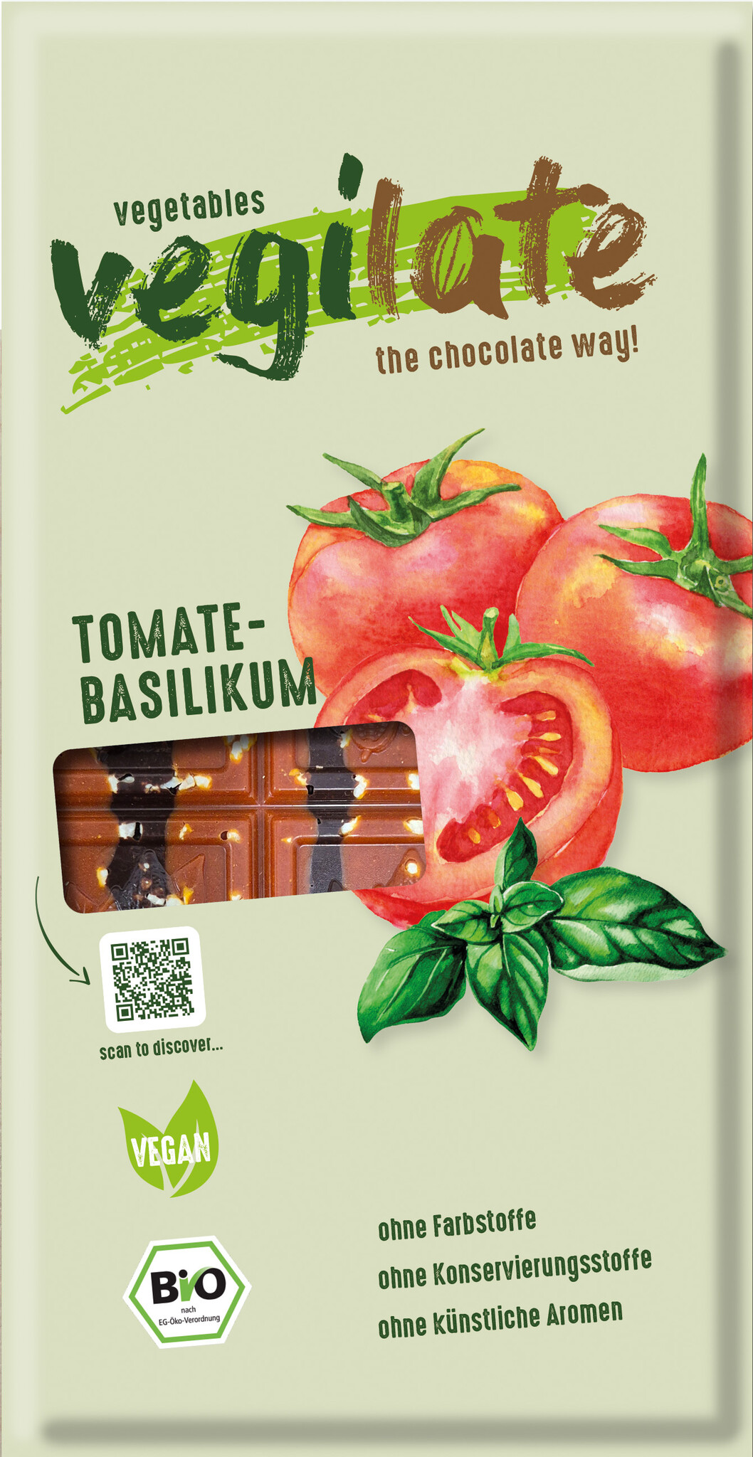 Startseite / - Vegilate Tomate & Basilikum – Vegane Schokoladentafel aus Deutschland mit innovativer Gemüse-Kakao-Fusion (70% Kakaoanteil)