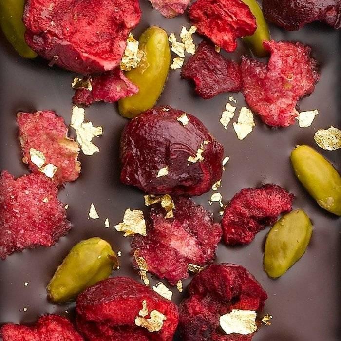 Startseite / - ENTRÉE | Valrhona dunkle Schokolade 70% mit Pistazien aus Bronte, gefriergetrocknete Sauerkirsch-Stücke, kandierte Rosenblätter und 23 Karat Goldflocken, 110g