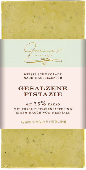 Tafel "Gesalzene Pistazie" ist eine verlockende Kombination aus cremiger weißer Schokolade und knackigen Pistazien, die mit einer Prise Meersalz abgerundet werden. Die süße und salzige Mischung sorgt für einen einzigartigen Geschmack.