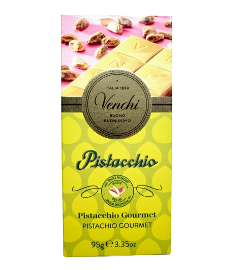Diese Pistazien-Tafel von Venchi vereint weiße Schokolade mit hochwertiger Pistazienpaste und ganzen, gerösteten Pistazien. Das Ergebnis: eine köstlich cremige Schokolade mit kräftigem Pistazienaroma und angenehm nussig-salziger Note. Ob als edles Geschenk oder als kleiner Genussmoment für zwischendurch — sie verwöhnt mit kräftigem Geschmack und zarter Textur. Das Zusammenspiel aus süßer Schokolade und nussiger Pistazie macht sie besonders, und durch die glutenfreien Zutaten eignet sie sich auch für Personen mit Gluten-Unverträglichkeit.