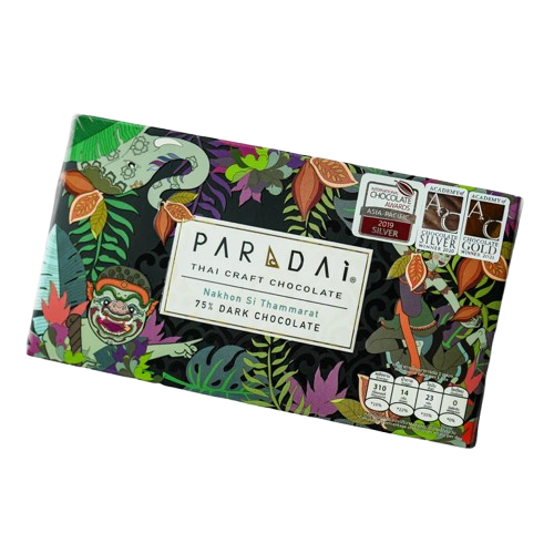 Diese dunkle Thai Single Origin Schokolade von Paradai mit Kakao aus Nakhon Si Thammarat. Kakaogehalt von 75% ist gut ausgewogen, schmilzt sehr angenehm und zeichnet sich durch ihre Komplexität aus mit würzigen Aromen gepaart mit einer sanften Süße