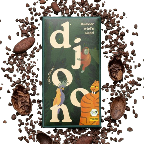 Intensive Bio-Kakaotafel aus 100 % Kakao aus Peru, ohne Zuckerzusatz, vegan und handgemacht von djoon. Pure Schokoladendunkelheit, überraschend frisch und fruchtig im Aroma.
