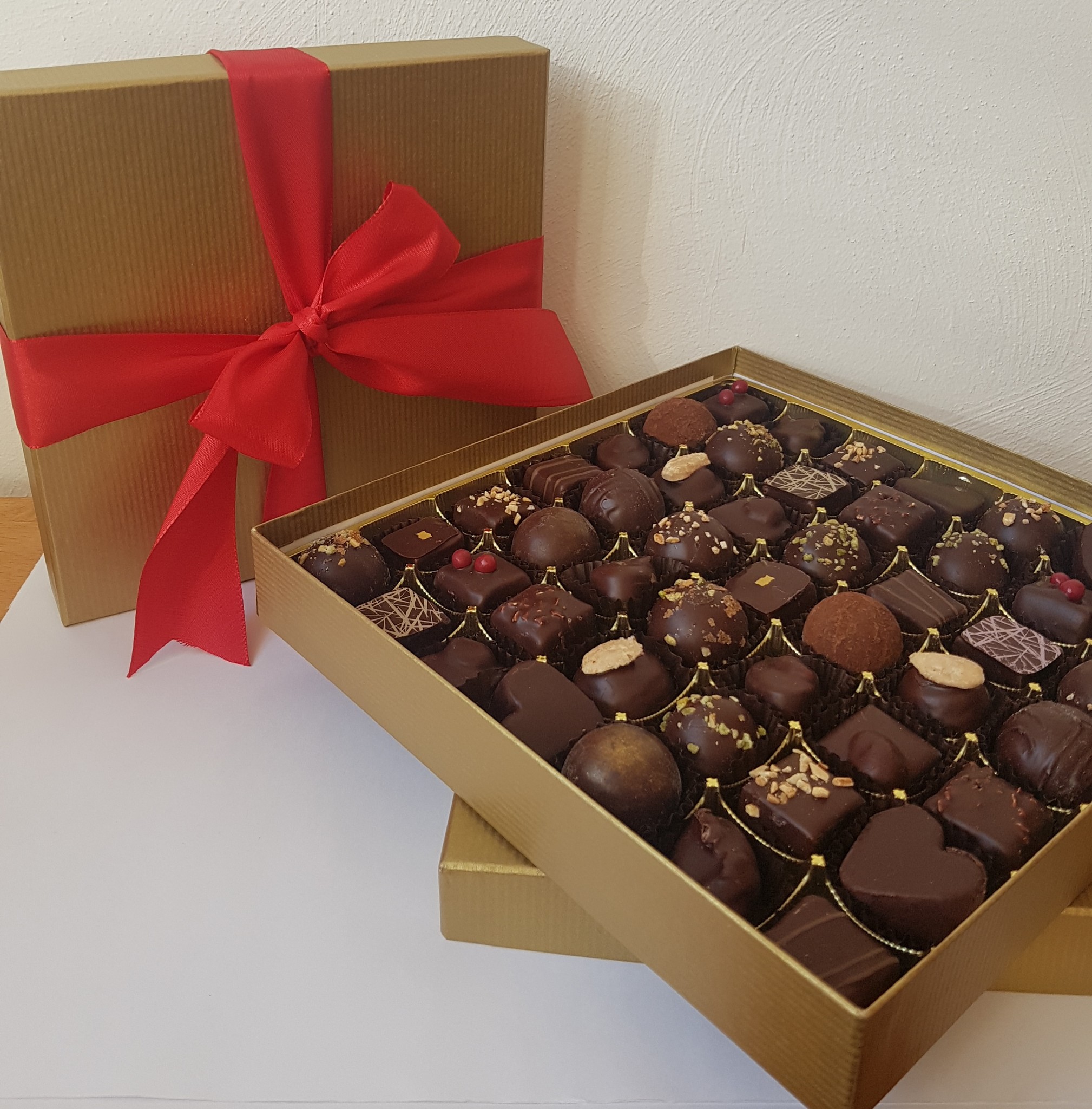 Mit Alkohol. Eine große Trüffeltruhe, gefüllt mit den Schätzen aus dem Weber & Weiss Pralinensortiment. Diese außergewöhnliche und repräsentative Präsentbox wird -genau wie Weber & Weiss Pralinen - Stück für Stück von Hand gefertigt.