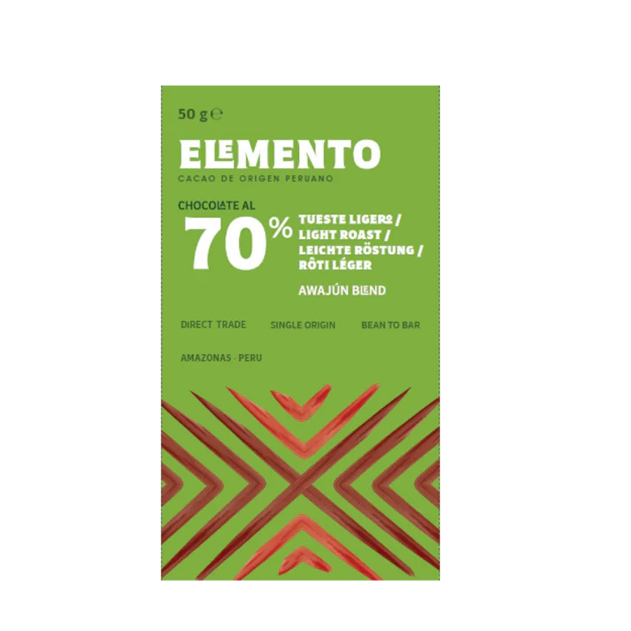 Diese dunkle Single Origin Schokolade der Amazonas Serie von Elemento mit Kakao von indigenen Awajún Gemeinschaften hat ein Kakaoanteil von 70%.