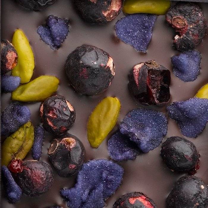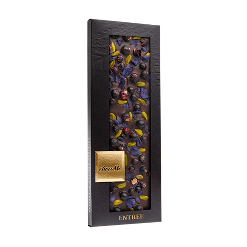 Startseite / - ENTRÉE | SYRAH II | Valrhona dunkle Schokolade 70% mit Pistazien aus Bronte, kandierte Veilchen und gefriergetrocknete Schwarze Johannisbeere, 110g
