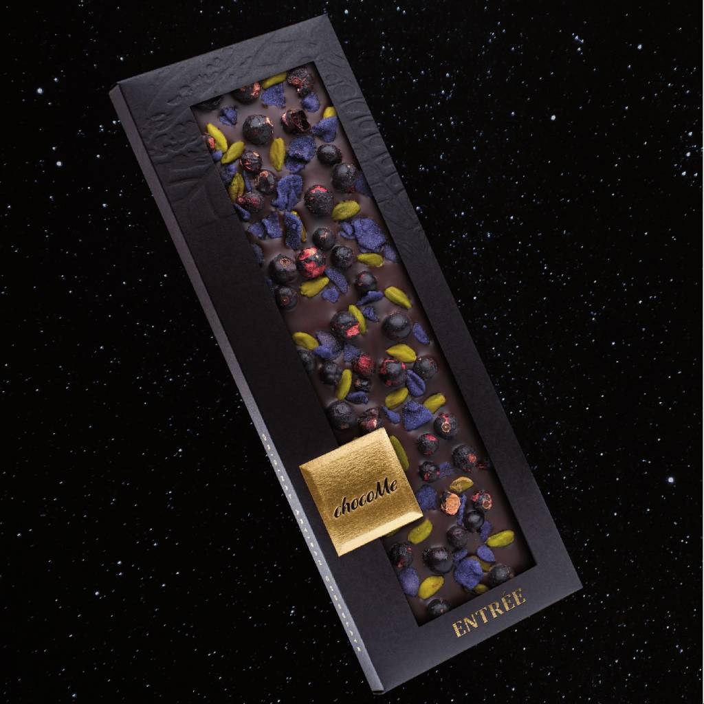 Wie harmonisch fügen sich schwarze Johannisbeeren mit dem Veilchenblau in die schwarze chocoMe-Verpackung ein. Und die schwarze Schokolade Valrhone hebt nur grüne Pistaziensterne hervor.