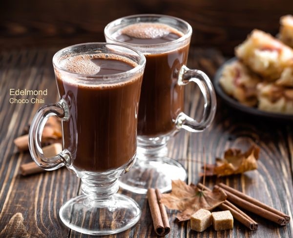 Edelmond Choco Chai besteht aus Schokoladendrops auf der Grundlage von Kakaobutter, die einfach in eine Tasse gegeben und mit heißer Flüssigkeit aufgefüllt werden.