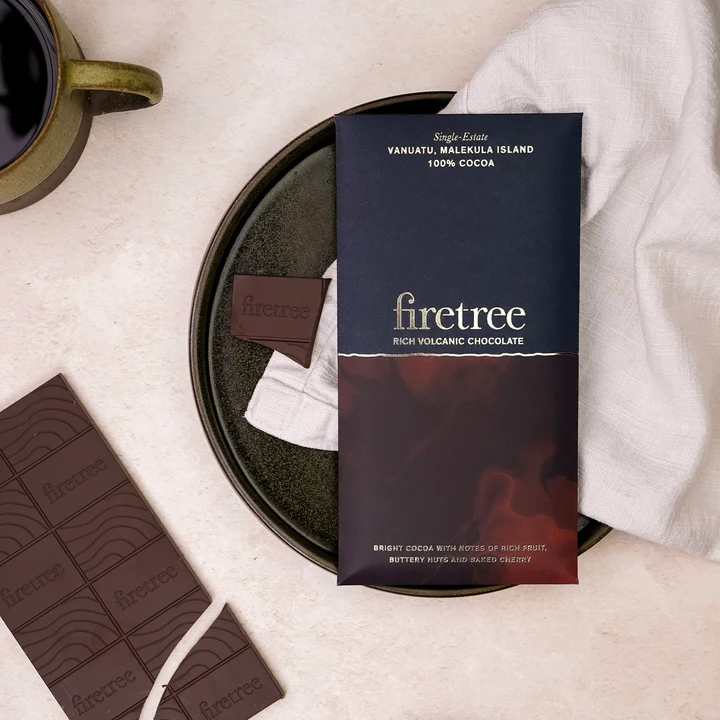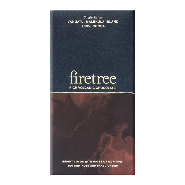 Erlebe Firetree Chocolate Vanuatu Malekula Island 100% Kakao, eine außergewöhnliche zuckerfreie Schokoladentafel aus dem Herzen Vanuatus. Die seltenen Kakaobohnen aus vulkanischem Boden werden voll- und langsam geröstet, um ein intensives, komplexes Aroma mit Noten von roten Früchten, Kakao und subtilen Nussnuancen zu entfalten. Dank der Bean-to-Bar-Handwerkskunst entsteht ein kraftvolles, reines Schokoladenerlebnis – ideal für echte Kakao-Puristen. Diese Schokolade ist nicht nur reich an Geschmack, sondern auch vegan sowie halal- und koscher-zertifiziert.