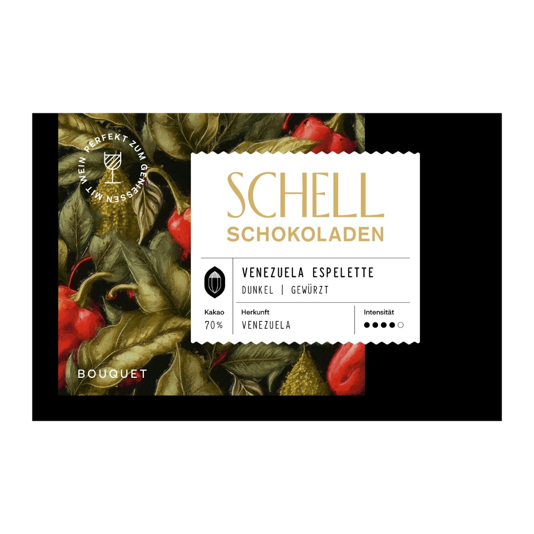 Diese exklusive dunkle Schokolade vereint edlen Kakao aus Venezuela mit der feinen Schärfe des Piment d’Espelette. Der Edelkakao stammt aus den traditionsreichen Anbaugebieten Venezuelas und ist bekannt für sein harmonisches Aroma und seine cremige Textur. Die sanfte Chiliwürze aus dem Baskenland rundet den Geschmack elegant ab, ohne die zarten Noten des Kakaos zu überdecken. Ideal als besonderes Geschenk oder zum Genießen mit Rot- oder Weißwein.