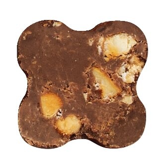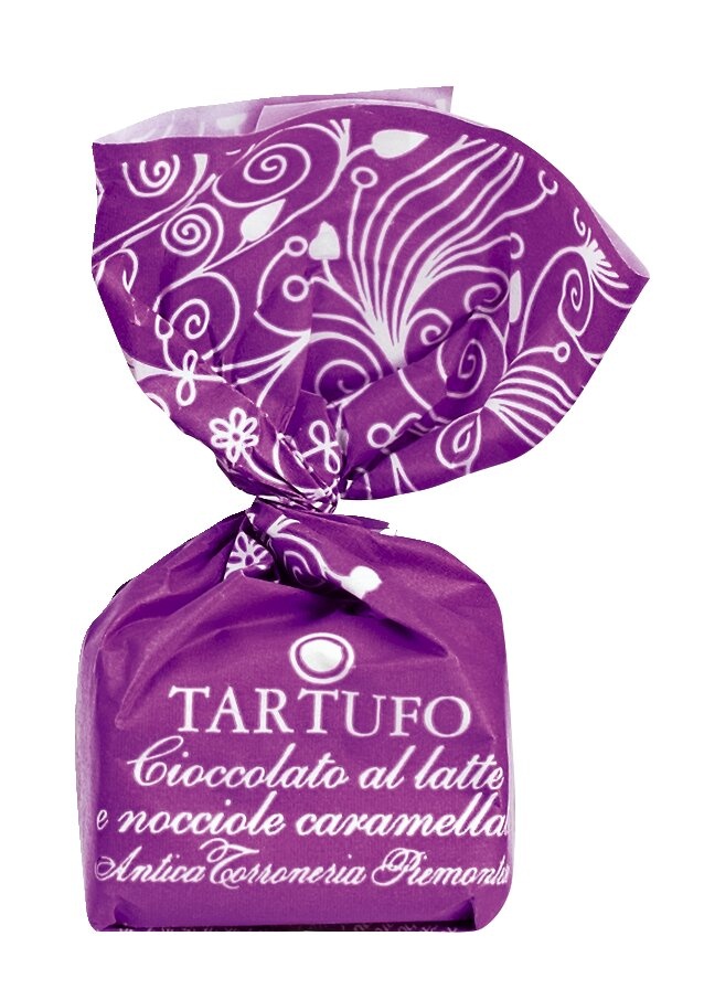 Süße Vollmilchtrüffel mit kleinen karamellisierten Piemont Haselnussstückchen für Schokoladenliebhaber. Der knusprige Biss ist das besondere an dem sonst cremigen Vergnügen.
